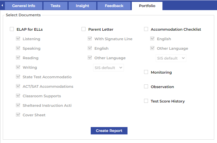The Portfolio tab is available to create and/or print all necessary reports for the student selected.